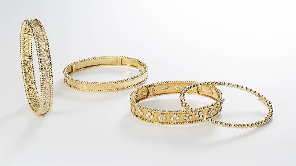 Коллекция Perlee пополнилась тремя новыми тонкими браслетами из белого, желтого или розового золота. Все — с фирменным для этой коллекции перляжем. Van Cleef & Arpels предлагает носить их по отдельности, надевать по два или три на одну руку, кроме того — сочетать с классическими браслетами Perlee: золотыми ободками с перляжем по краям и сатинированной или декорированной бриллиантами (паве или инкрустация в форме клевера) поверхностью. Среди классических предметов Perlee есть и кольца для помолвки, и обручальные кольца, с которыми новые браслеты выглядят не хуже.