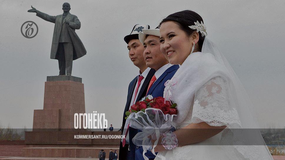 А на площади Ленина под не попавшую в кадр гармошку гуляют киргизские молодожены