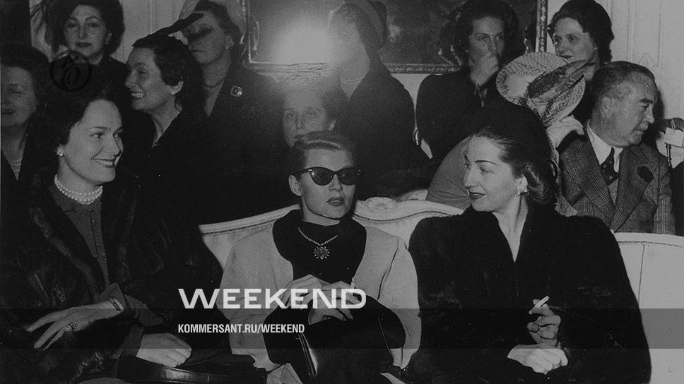 В центре: актриса Рита Хейворт и Бегум Ага-хан III (Ивонна Лабрусс, жена султана Мухаммад-шаха Ага-хана III) на презентации коллекции Christian Dior "весна-лето 1959"