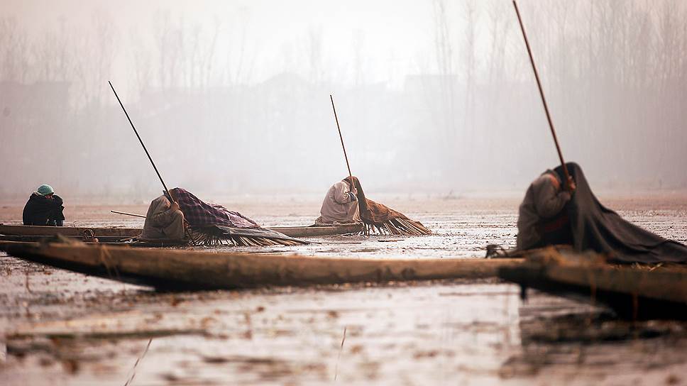 Срингар, Индия. Местные жители укрываются от холода во время рыбалки