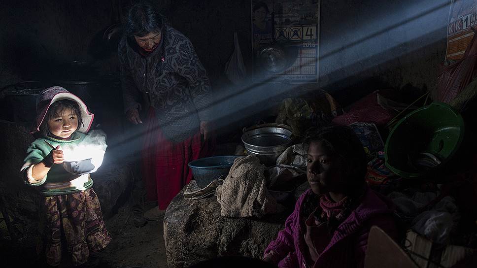 Озеро Титикака, Перу. Девочка держит кастрюлю с приготовленной едой