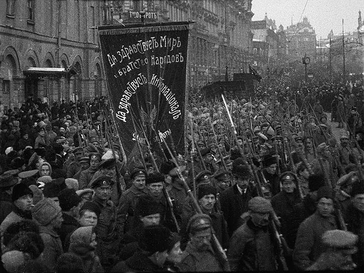 На фото: солдаты Волынского полка идут с транспарантами к Таврическому дворцу, где заседала дума