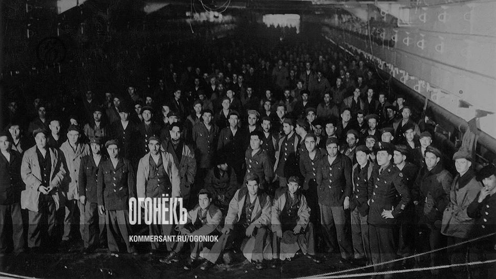 Из плена -- в плен. Русские, попавшие к союзникам из окопов и немецких концлагерей, на пути в Великобританию, где их ждут новые лагеря. Фото 1944 года
