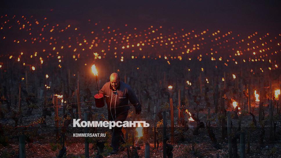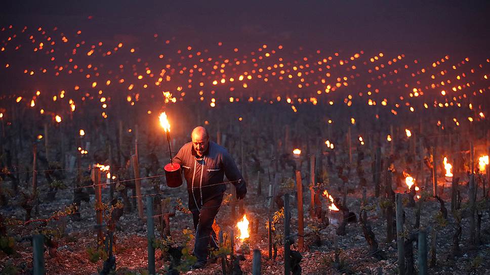 Шабли, Франция. Винаградари зажигают факелы, чтобы защитить растения от замерзания