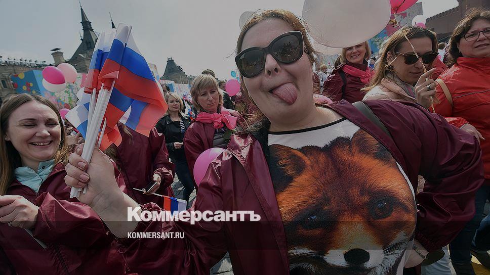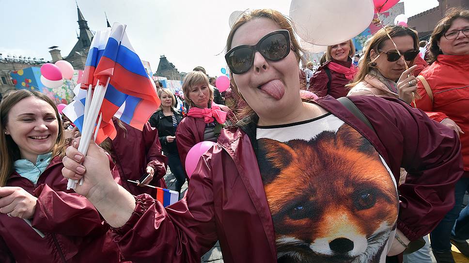 Участники традиционного первомайского шествия профсоюзов на Красной площади позируют на камеру