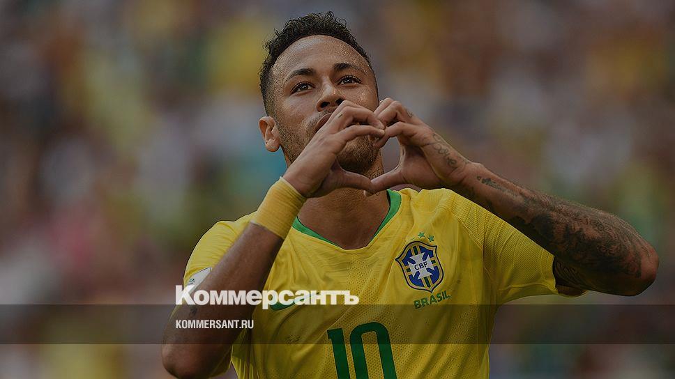 Матч между сборными Бразилии и Мексики на стадионе «Самара Арена». Бразильский игрок Неймар празднует забитый гол, сложив руки в виде сердца