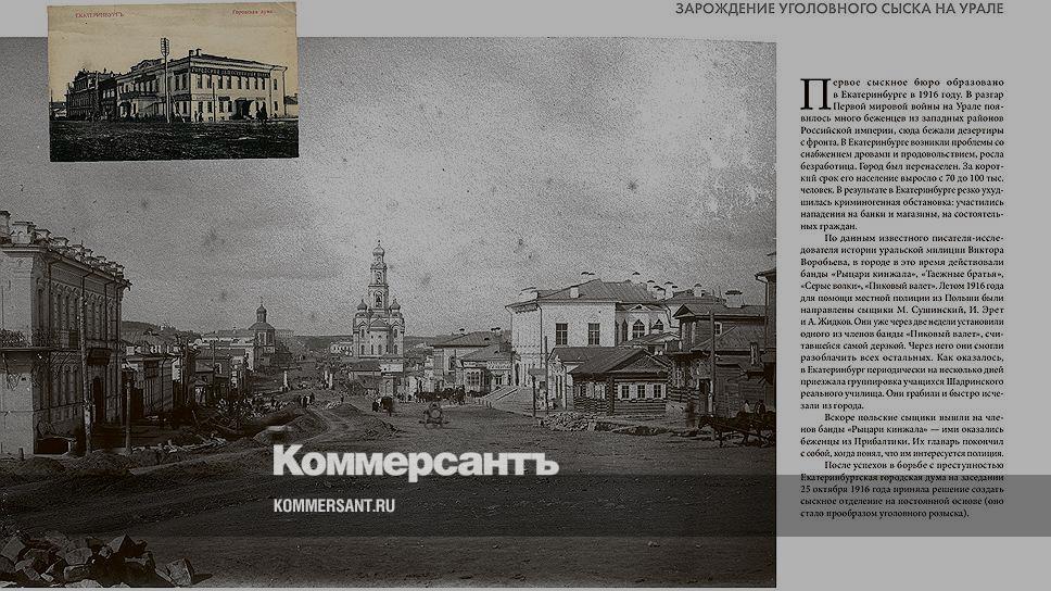 Первое сыскное бюро (прообраз уголовного розыска) образовано в Екатеринбурге в 1916 году. В разгар Первой мировой войны на Урале появилось много беженцев из западных районов. В Екатеринбурге резко ухудшилась криминогенная обстановка: участились нападения на банки и магазины, на состоятельных граждан. В городе в это время действовали банды «Рыцари кинжала», «Таежные братья», «Серые волки», «Пиковый валет».