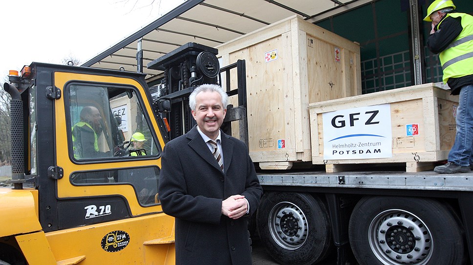 Профессор Райнхард Хюттель. Идет погрузка оборудования для российских коллег