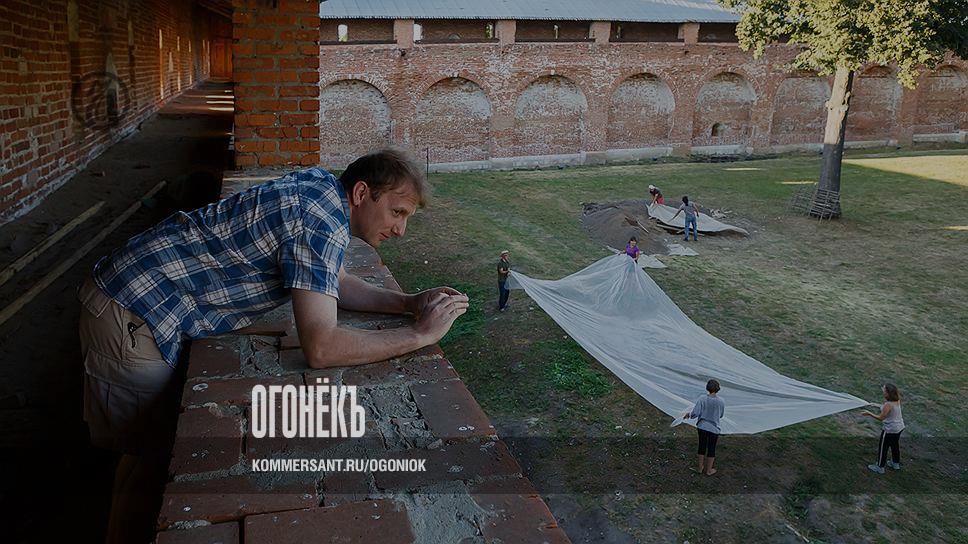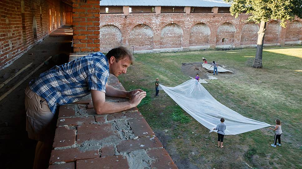 Руководитель археологической экспедиции Сергей Лев фотографирует раскопки со стен Зарайского кремля