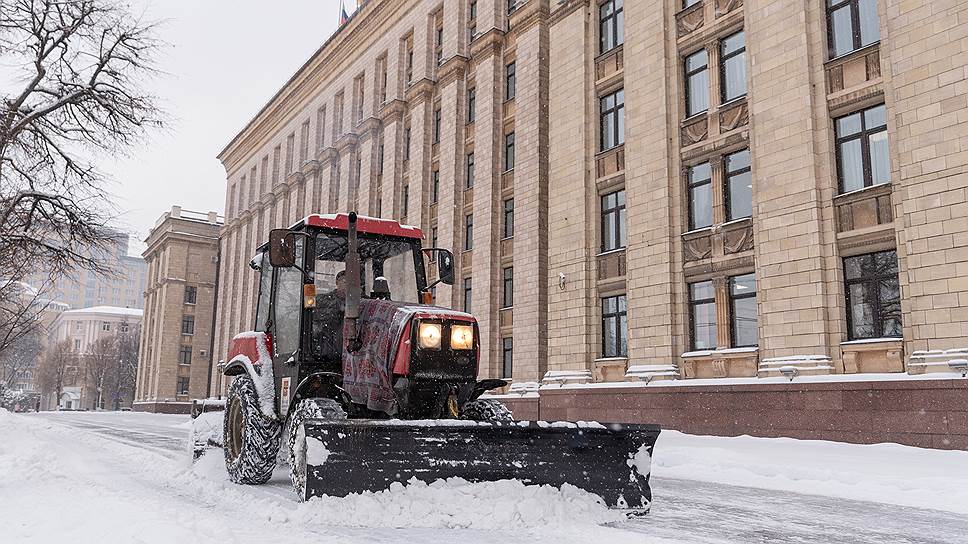 После сильных снегопадов улицы Воронежа в начале декабря убирали до 200 единиц снегоуборочной техники (всего у городских властей их около 300). На фото: уборка у правительства Воронежской области.