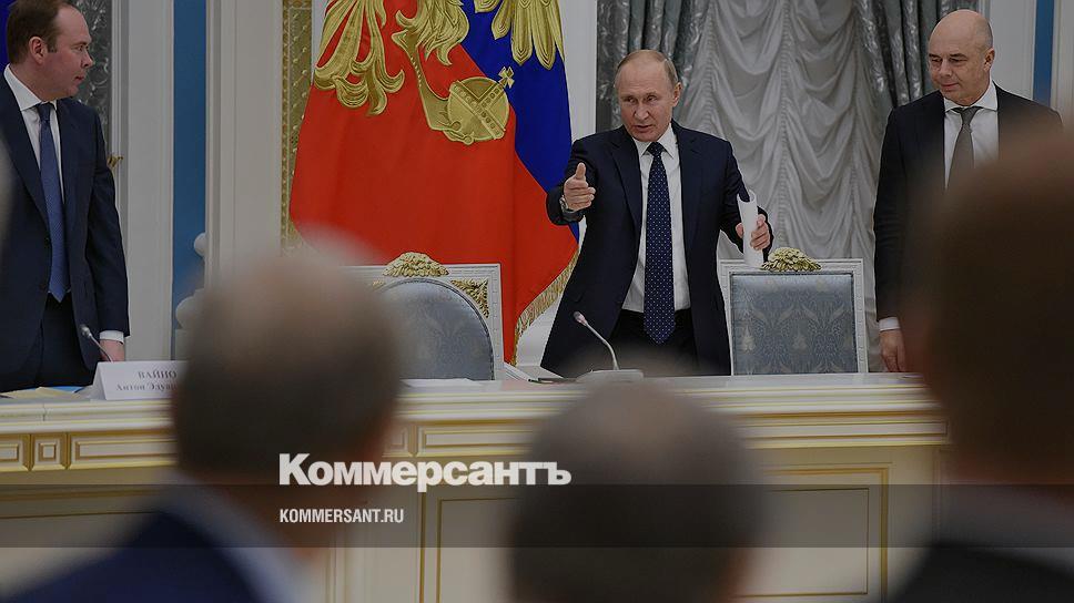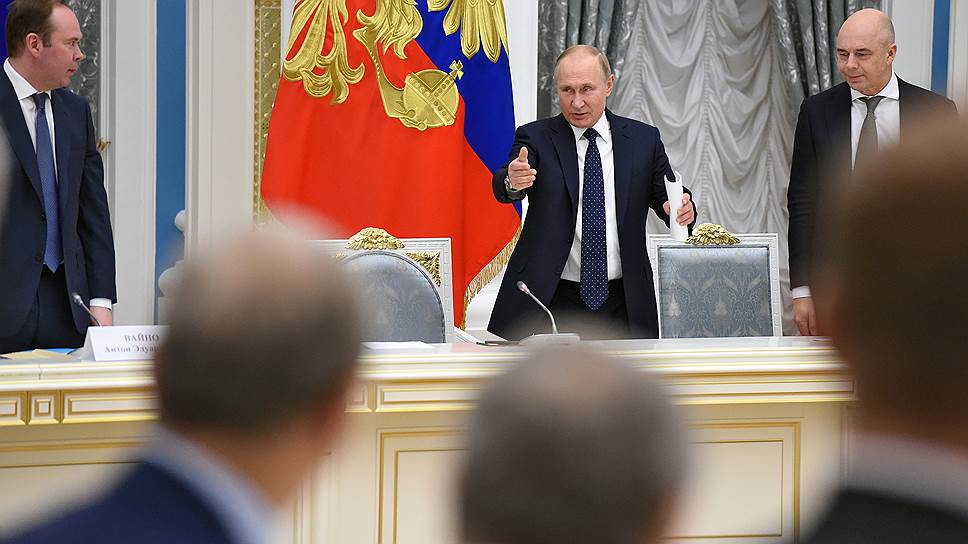 Слева направо: глава администрации президента РФ Антон Вайно, президент Владимир Путин и первый вице-премьер — министр финансов РФ Антон Силуанов во время встречи главы государства с представителями деловых кругов в Кремле