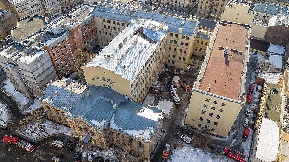 Учебный комплекс университета ИТМО после обрушения кровли и несущих конструкций в дворовом корпусе 16 февраля 2019 года. Здание бывшего Коммерческого училища (1871 год), дворовые корпуса. Надстроены двумя этажами в 1960-е годы. Памятник регионального значения. Два периферийных корпуса построены в 1970-1980-е годы