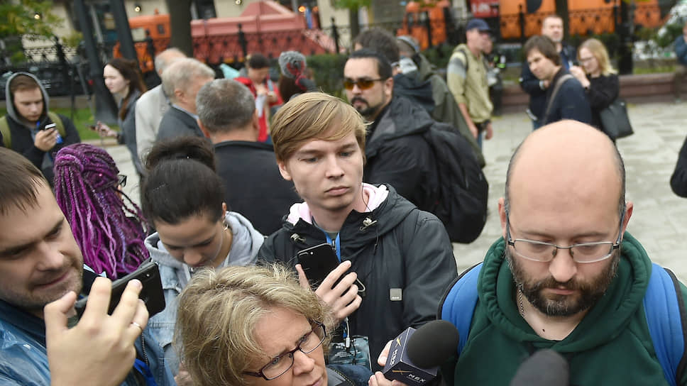 Журналист Илья Азар во время одиночного пикета за допуск независимых кандидатов на выборы в Мосгордуму у памятника Надежде Крупской на Сретенском бульваре