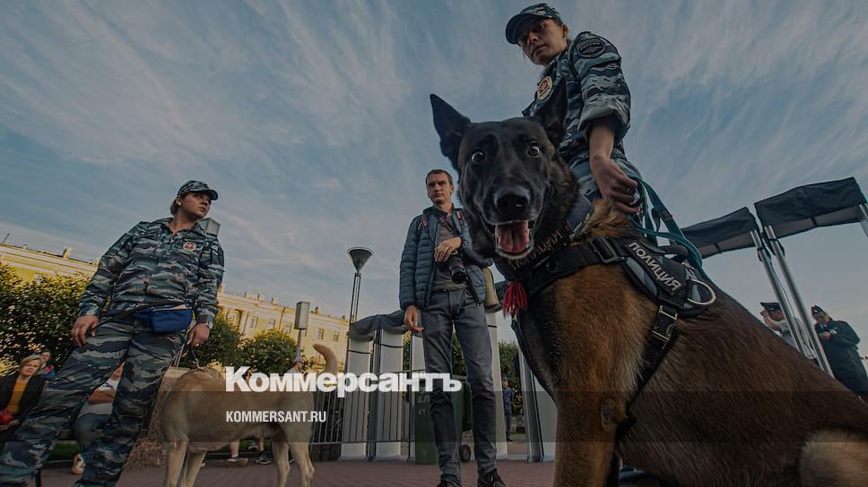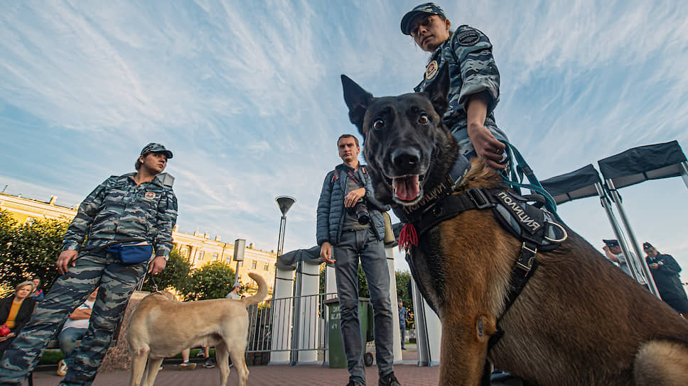 Сотрудник полиции со служебной собакой перед митингом "Против произвола на выборах" на Площади Ленина