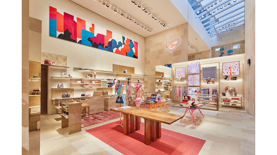 Картина Сары Краунер «Rising and Falling Forms (Magenta, Peacock, Scarlet)» (2019 год) и скульптура Трейси Эмин «Love is What You Want» (2011 год) в бутике Louis Vuitton на Нью-Бонд-стрит в Лондоне