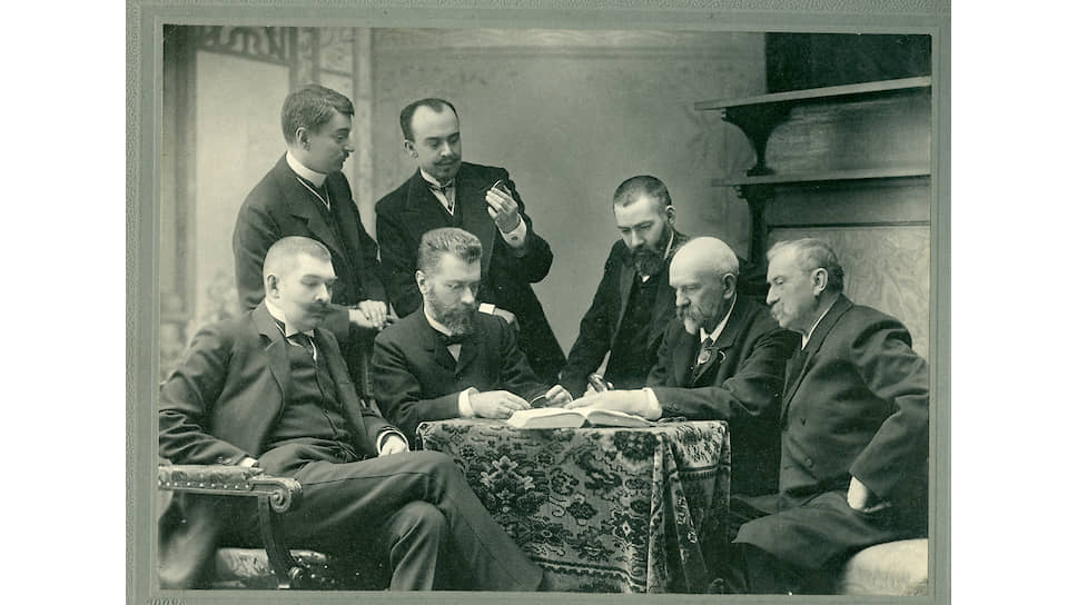 Члены Московского нумизматического общества. Сидят слева направо: С. И. Чижов, П. В. Зубов, А. В. Орешников, Г. Г. Клингерт; стоят: С. В. Прохоров, Ф. И. Прове, А. А. Карзинкин. 11 мая 1908 года