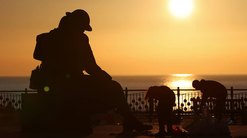 Сихэм, Великобритания. Люди выкладывают галькой знак победы возле статуи солдата