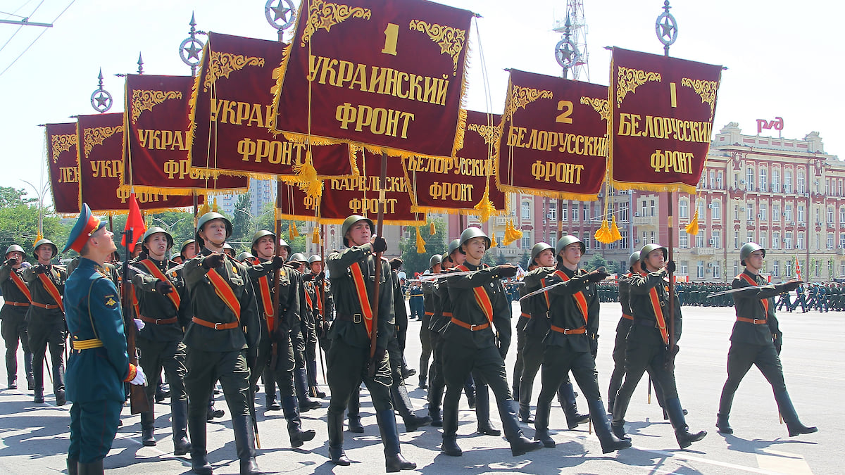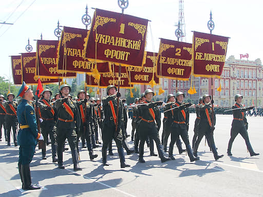 Военный парад на Театральной площади, посвященный 75-летию Победы в Великой отечественной войне. Военнослужащие с флагами и штандартами фронтов во время парада.