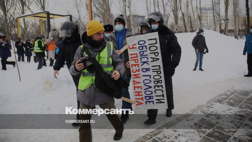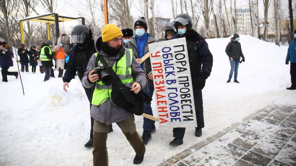 Несанкционированный митинг в поддержку Алексея Навального в Екатеринбурге. Задержание мужчины с плакатом "Пора провести обыск в голове у президента"