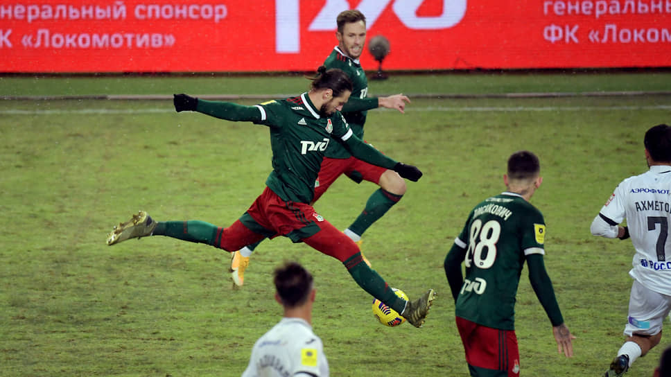 Игрок «Локомотива» Гжегож Крыховяк (в центре) во время матча против ЦСКА забивает второй гол своей команды