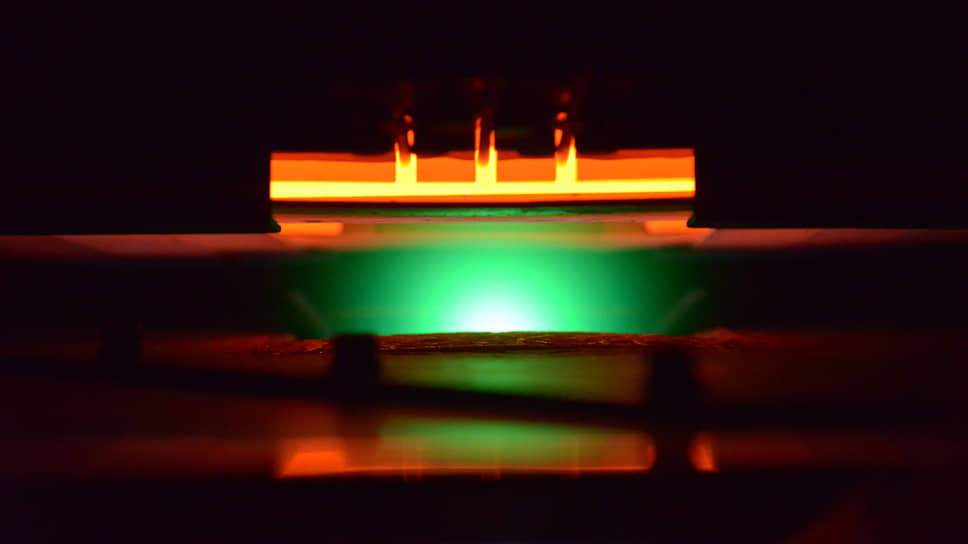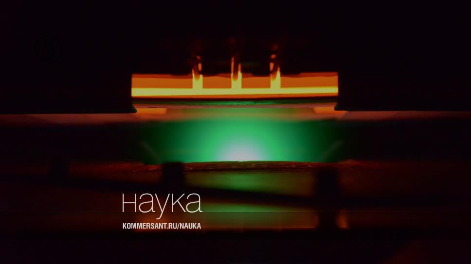 Процесс лазерного осаждения слоя сверхпроводника на металлическую ленту проходит в вакууме при температуре около 800 градусов