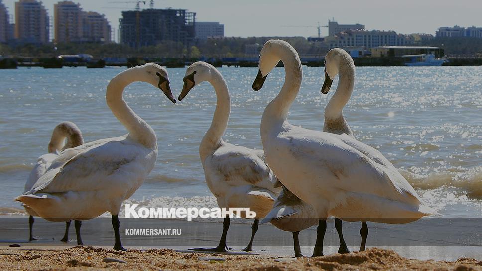 Белые лебеди на городском пляже города-курорта Геленджик. Май 2013 года
