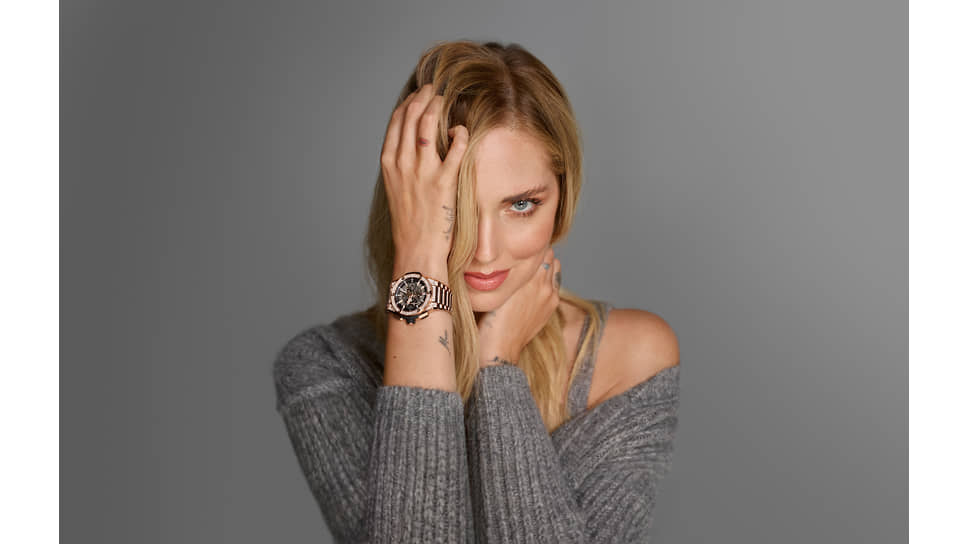Кьяра Ферраньи в унисекс-часах Hublot Big Bang Millennial Pink. Корпус 42 мм из легкого алюминия розового оттенка millennial pink, механизм Unico, запас хода 72 часа. Часы созданы в сотрудничестве с Лапо Элканном и Garage Italia