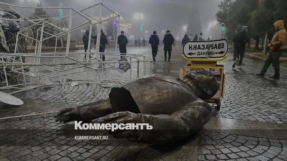 В казахстанском городе Талдыкоргане группа протестующих повалила памятник первому президенту страны Нурсултану Назарбаеву.В Казахстане со 2 января не прекращаются протесты, связанные с повышением цен на сжиженный газ. Также демонстранты захватили международный аэропорт в Алматы. Президент Касым-Жомарт Токаев ввел режим ЧП на территории всей страны и обратился к ОДКБ за помощью. Подробнее о ходе событий в стране — в онлайн-трансляции «Ъ».