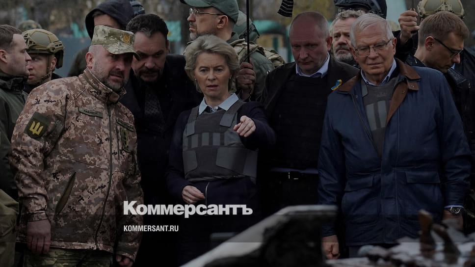 Урсула фон дер Ляйен, Жозеп Боррель и премьер Украины Денис Шмыгаль по время посещения Бучи