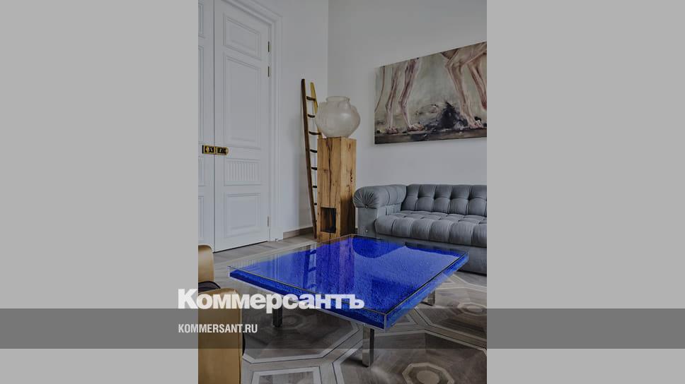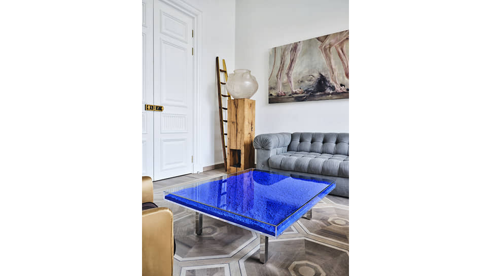 На заднем плане: пьедестал и ваза Mother, дизайн студии Rooms; слева: картина «Собака помнит, где зарыла кость» из серии «Пустое место», художник Татьяна Подмаркова. Холст, масло; лестница, Studio Valentin Loellmann; диван St. James, дизайн Жака Гарсии. Лимитированная коллекция Baker; столик Table bleu Klein с пигментом International Klein Blue (IKB), художник Ив Кляйн. Все — галерея Tirage 1/1