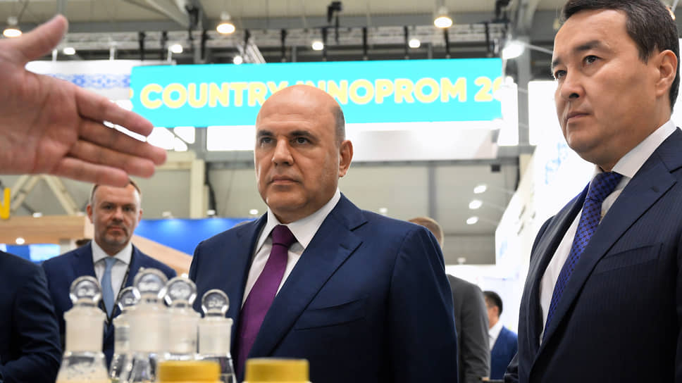 Председатель правительства России Михаил Мишустин (в центре), министр промышленности и торговли России Денис Мантуров (второй справа) и премьер-министр Казахстана Алихан Смаилов (справа) на выставке "Иннопром"