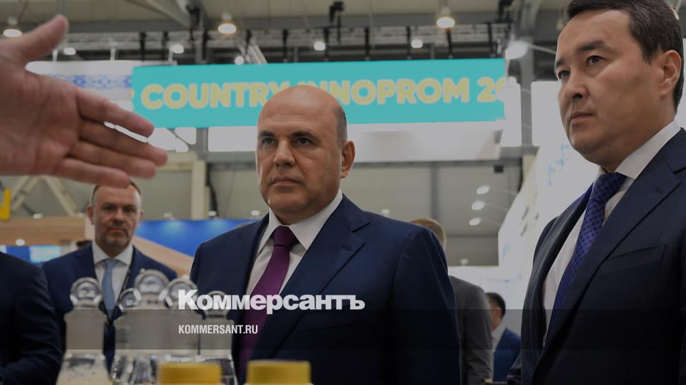 Председатель правительства России Михаил Мишустин (в центре) и премьер-министр Казахстана Алихан Смаилов (справа) на выставке