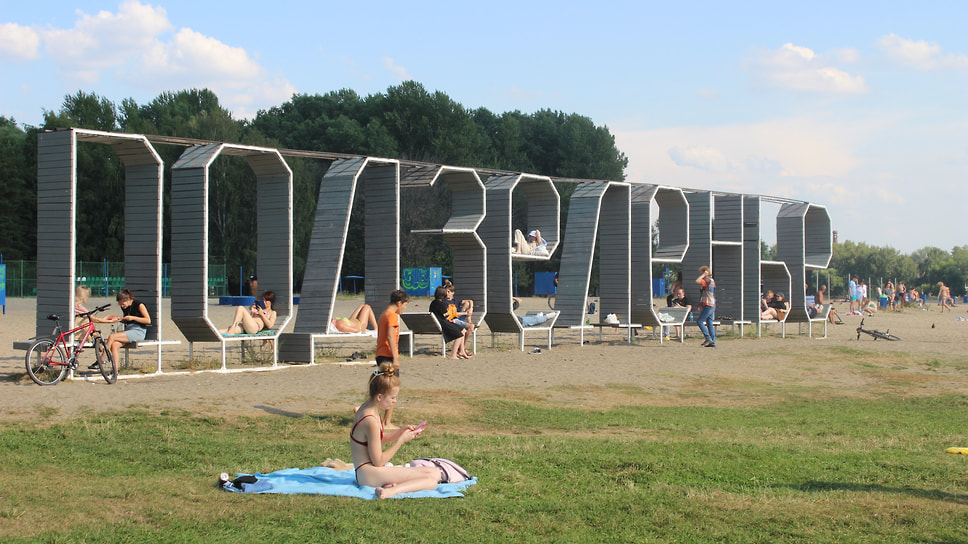 Люди в центре Ярославля на берегу реки Которосль на пляже Подзеленье прячутся от зноя в тени огромных букв с названием локации