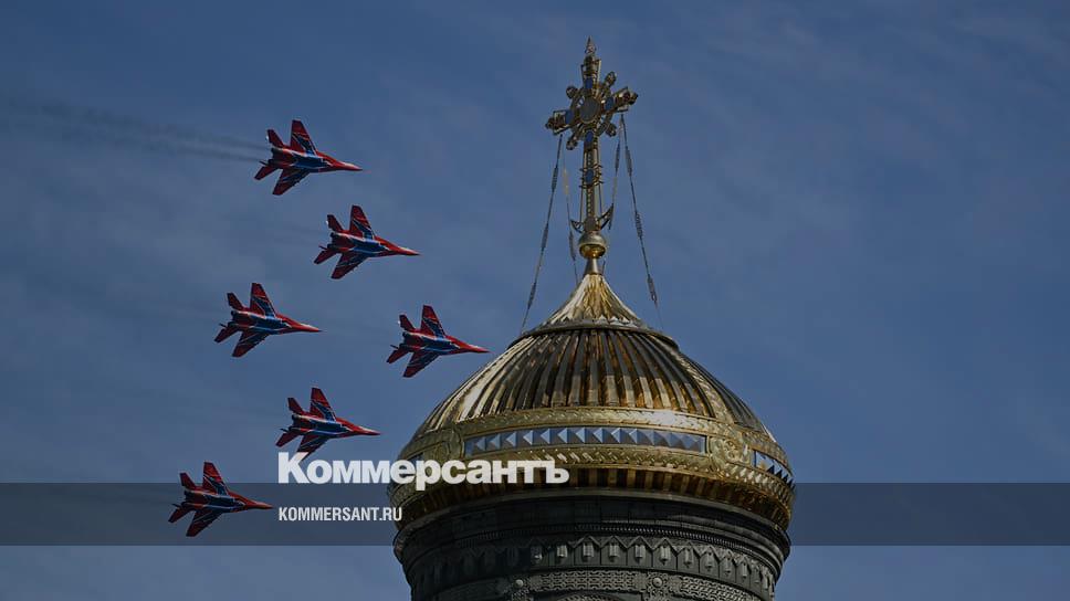МиГ-29УБ авиационной группы «Стрижи» пролетают над Главным храмом вооруженных сил России