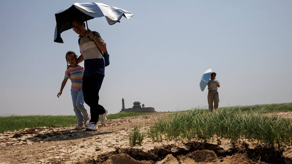 Цзянси, Китай. Люди идут по высохшему из-за жары участку озера Поянху