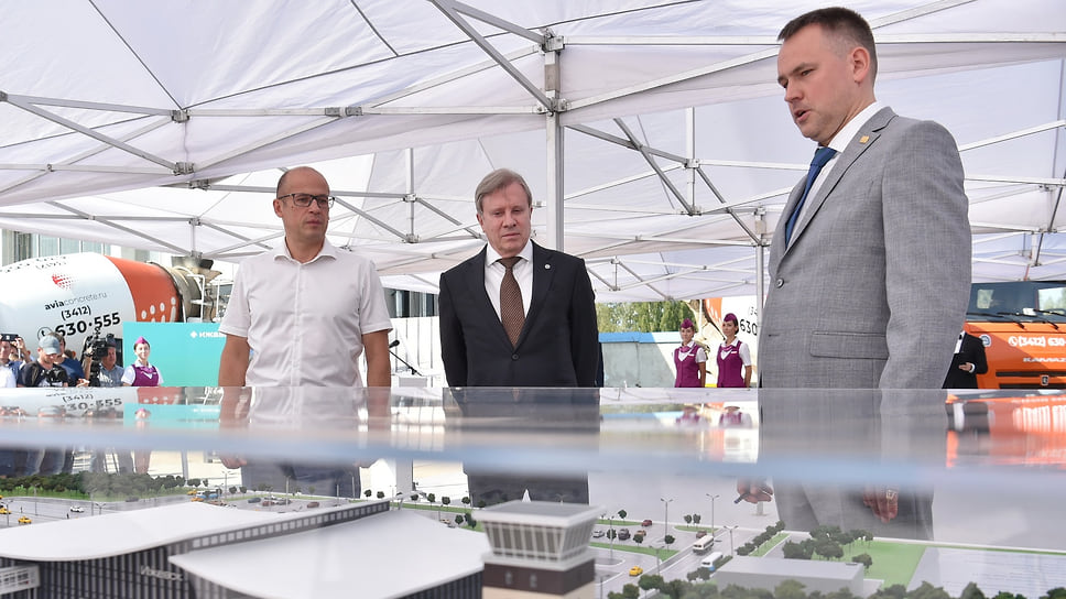 Глава Удмуртии Александр Бречалов, министр транспорта РФ Виталий Савельев и директор "Ижавиа" Александр Синельников у макета будущего терминала аэропорта Ижевска
