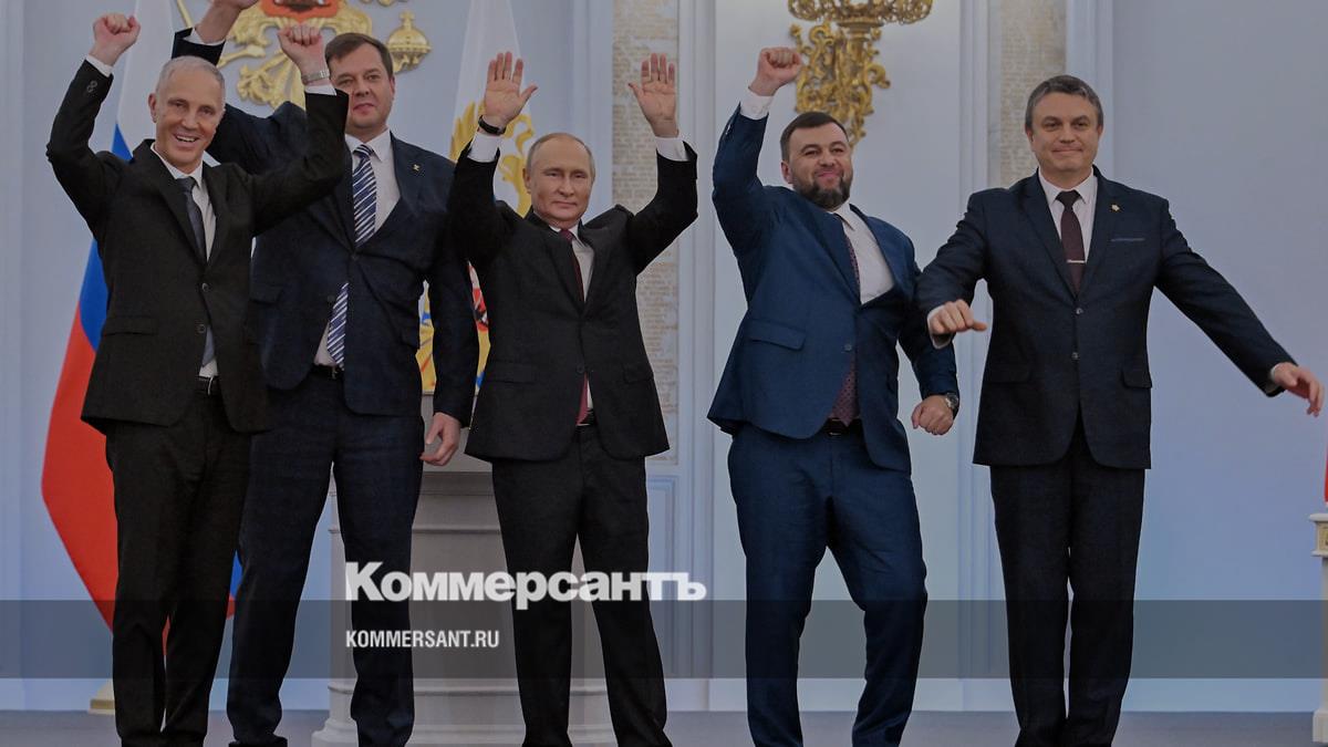 Слева направо: глава администрации Херсонской области Владимир Сальдо, глава администрации Запорожской области Евгений Балицкий, президент России Владимир Путин, глава Донецкой народной республики (ДНР) Денис Пушилин и глава Луганской народной республики (ЛНР) Леонид Пасечник