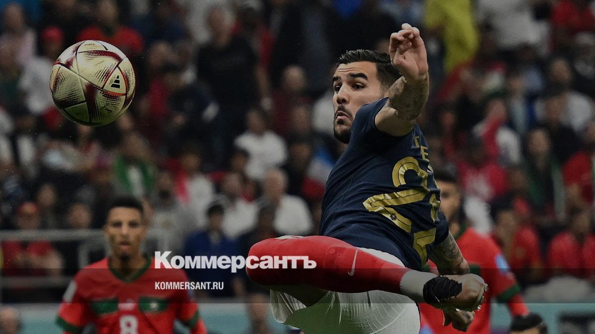 Защитник французской сборной Тео Эрнандес забивает первый гол в полуфинальном матче против Марокко