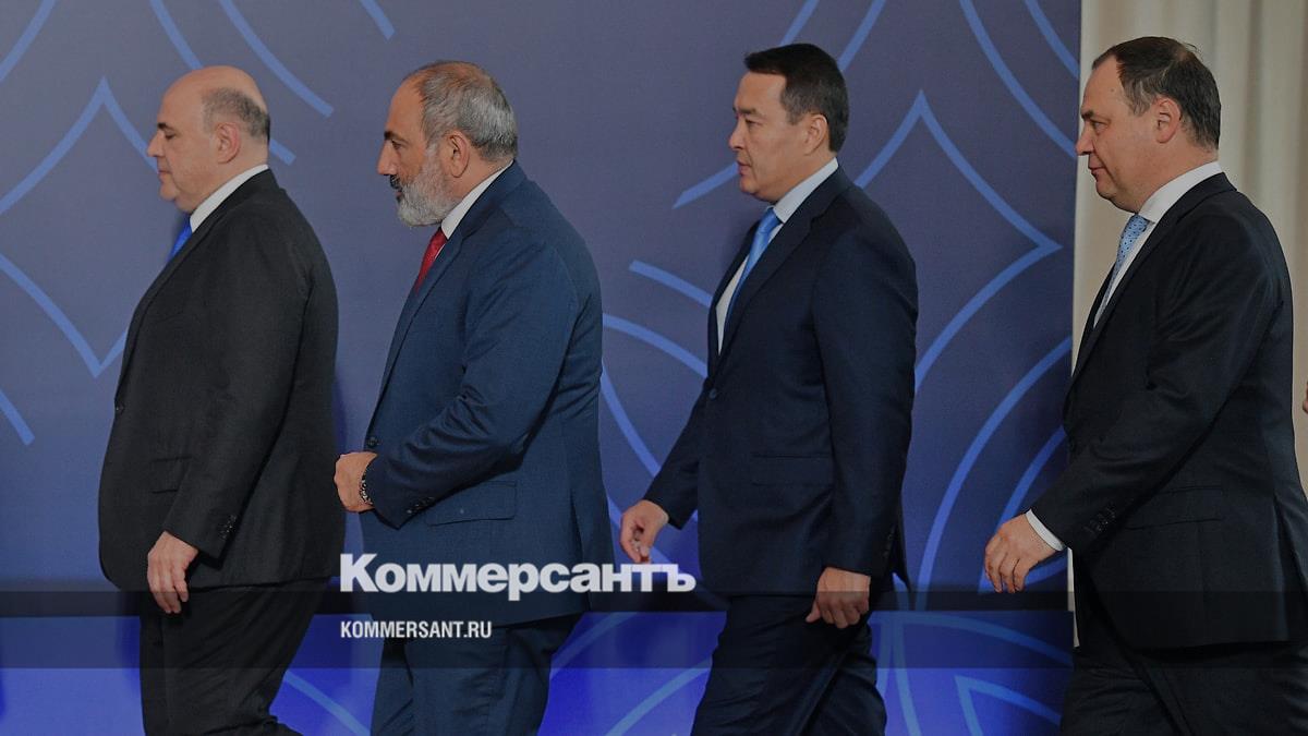Ереван, Армения. Слева направо: премьер-министры России, Армении, Казахстана и Белоруссии Михаил Мишустин, Никол Пашинян, Алихан Смаилов и Роман Головченко перед началом заседания Евразийского межправительственного совета