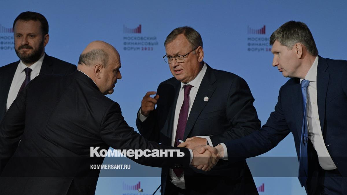 На фото (слева направо): помощник президента Максим Орешкин, председатель правительства России Михаил Мишустин, глава ВТБ Андрей Костин и министр экономики Максим Решетников на пленарном заседании