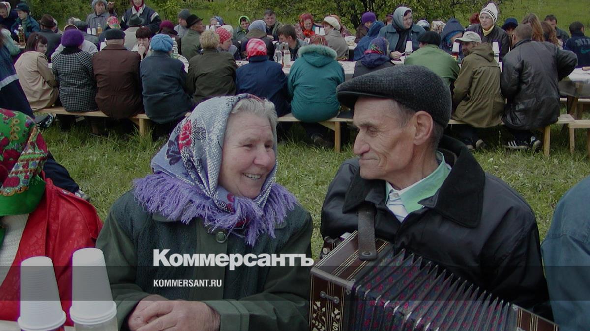 Пенсионер играет на гармони своей знакомой во время деревенского застолья