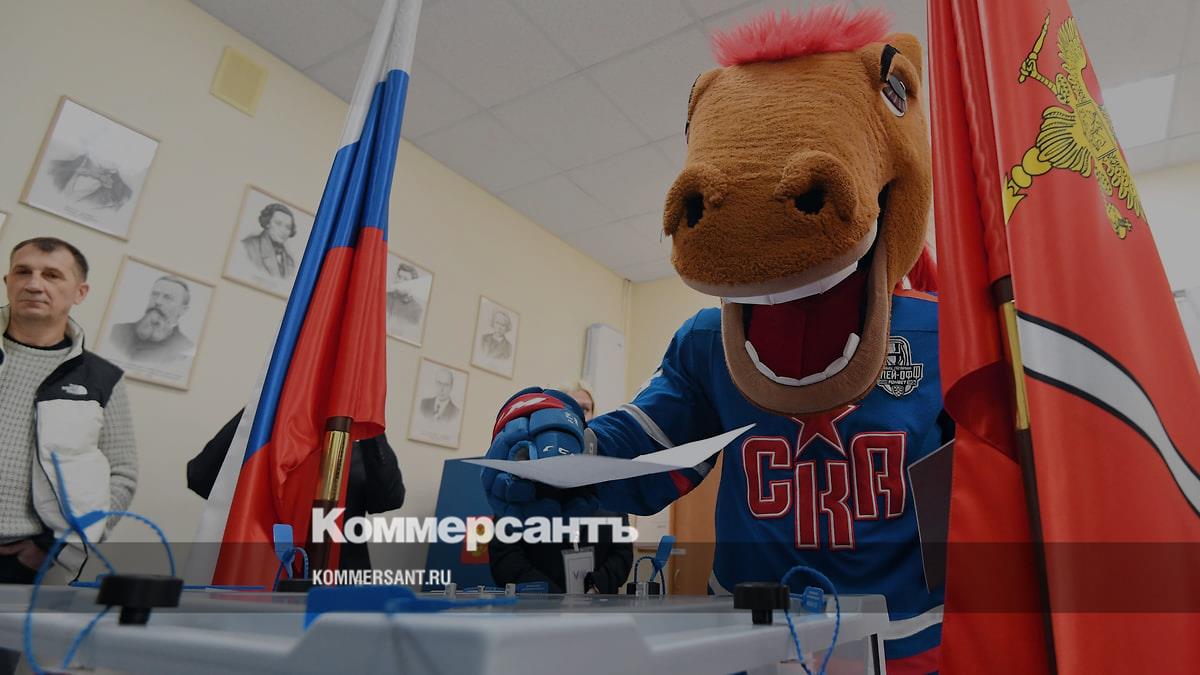Санкт-Петербург. Талисман хоккейного клуба СКА Конь-Огонь голосует в лицее №366 — ближайшем к «СКА Арене» избирательном участке