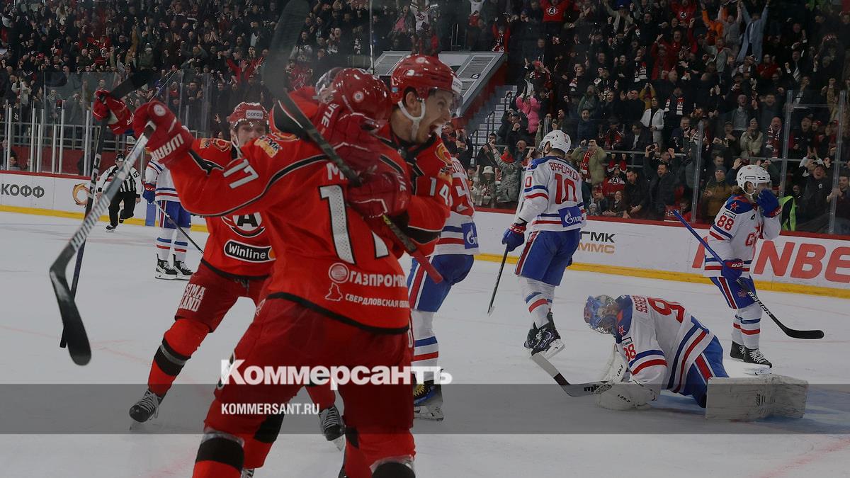 Момент матча между командами «Автомобилист» (Екатеринбург) и СКА (Санкт-Петербург) на стадион «Уралец» (21 марта 2024 года)