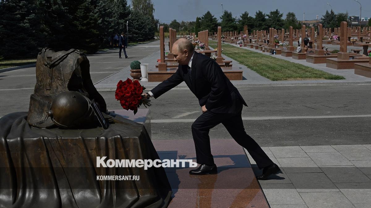 Владимир Путин возлагает цветы к памятнику бойцам спецназа подразделений «Альфа» и «Вымпел», погибшим при штурме школы № 1