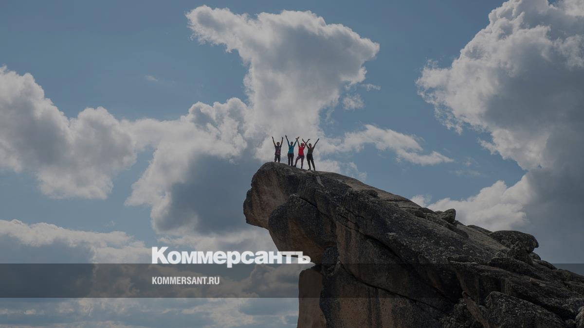 Туристы на скале Зуб Дракона на территории природного парка Ергаки, Красноярский край