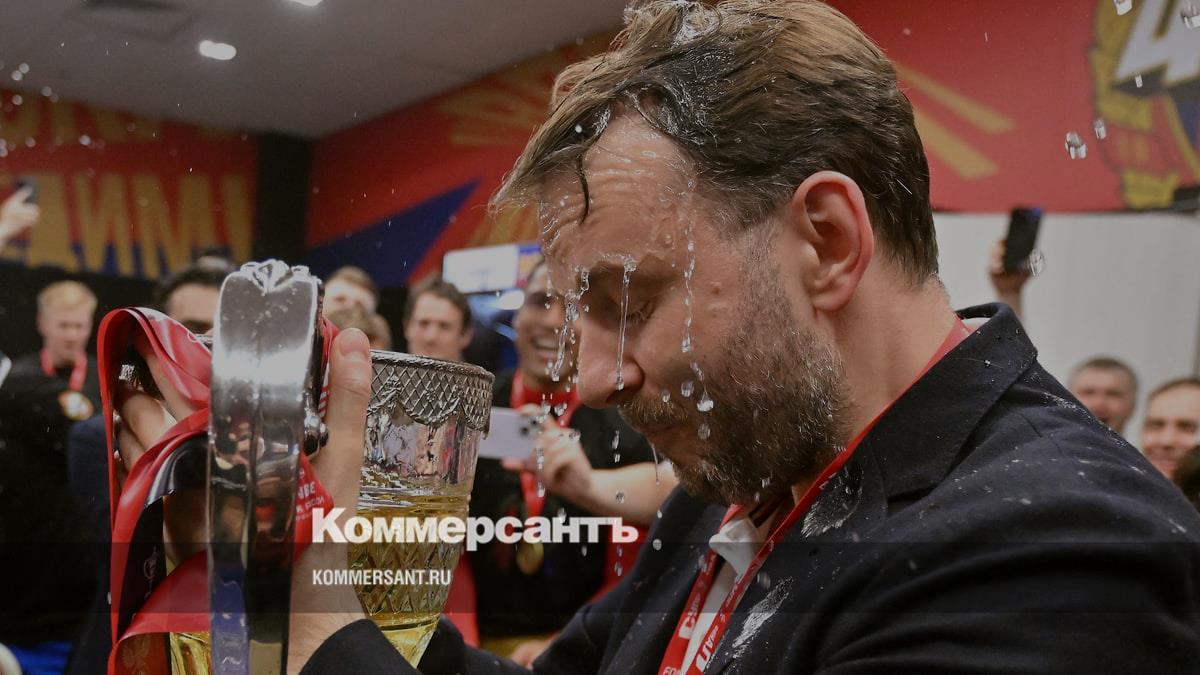 Замглавы администрации президента РФ Максим Орешкин и игроки команды ЦСКА празднуют победу в суперфинале Кубка России в Москве