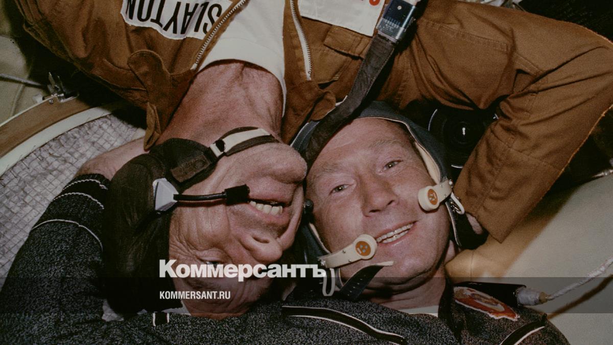 Космонавты Дональд Слейтон (слева) и Алексей Леонов после стыковки «Аполлон-18» и «Союз-19», июль 1975 года