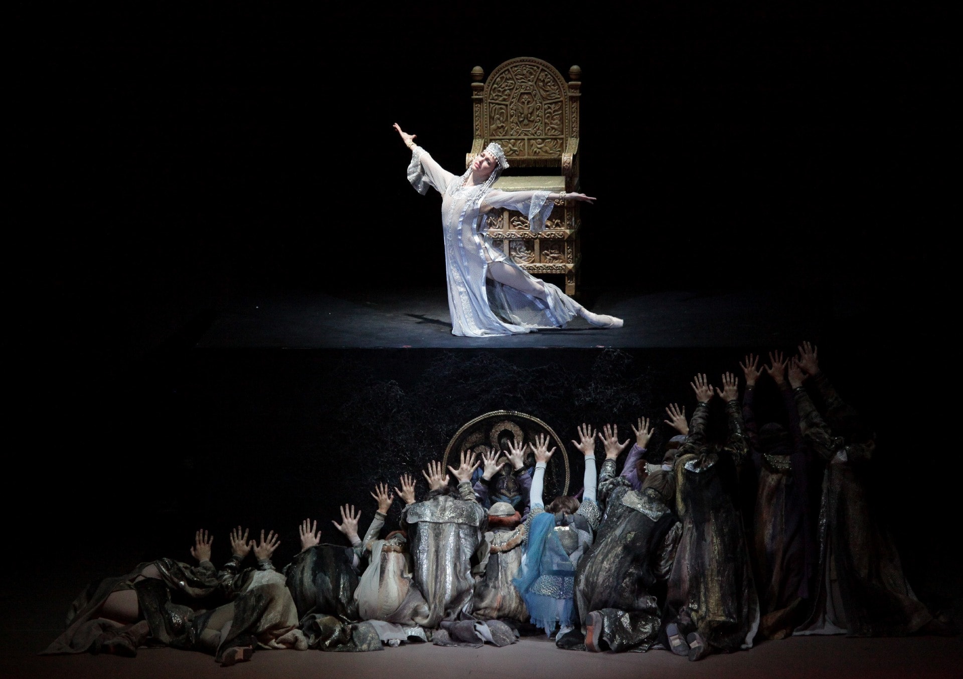 «Иван Грозный». Сцена из спектакля, Анастасия — Анна Никулина. Возобновление легендарной постановки 1975 года, которую сезон спустя в 1976-м позаимствовала у Большого Grande Opera. Юрий Григорович и Михаил Чудаки соединили музыку Симфонии Прокофьева из одноименного фильма с «Русской увертюрой», Третьей Симфонии и «Александра Невского» и создали драм балет в исторических декорациях кудесника Симона Вирсаладзе, придумавшего как сделать боярские шубы легкими как туники. 2012 год.
