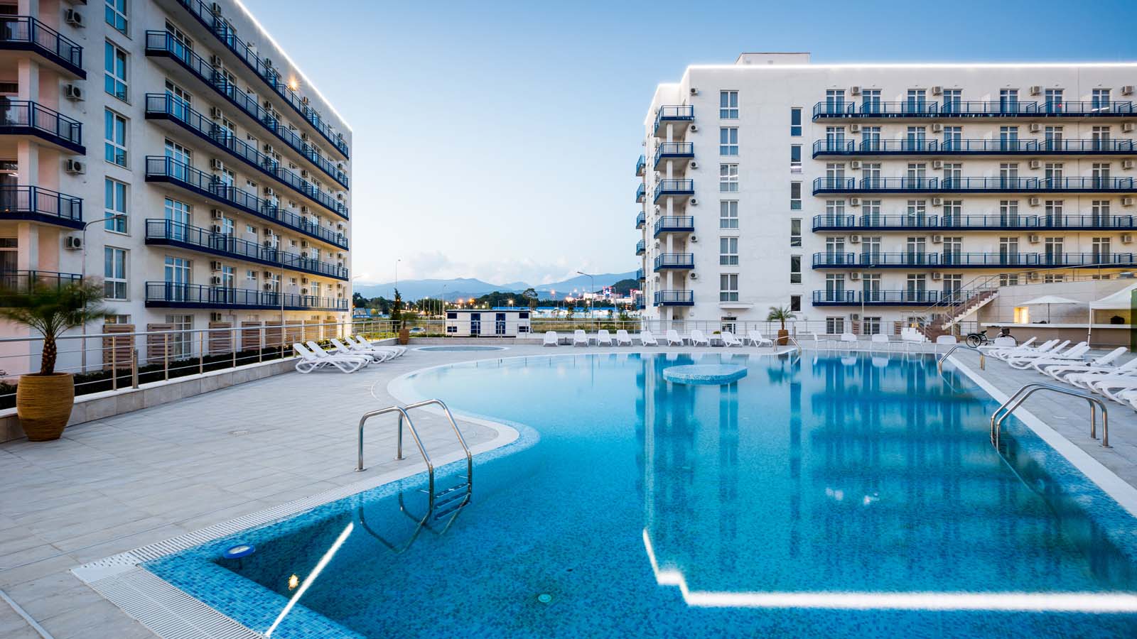 Белые корпуса Прибрежного района «Имеретинского» с синими балконами стоят ровно, как фигуры на шахматной доске перед началом партии. В центре — бассейн с белыми зонтиками, в котором купаются дети. Взрослые, вооружившись журналами, лениво дремлют в шезлонгах. В то, что еще совсем недавно здесь шумела Олимпиада, а до этого несколько лет подряд работали тысячи строителей, трудно поверить.